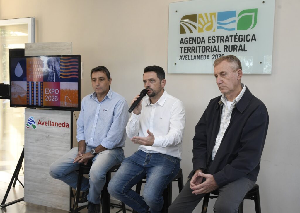 El Intendente Gonzalo Braidot, junto a José Luis Sponton, Presidente de la Asociación Civil Impulsar Avellaneda y Adrián Gallard, Ing. Agrónomo de la Unión Agrícola de Avellaneda, encabezó el lanzamiento de Tecno Riego Litoral en el Centro de Desarrollo Rural de Avellaneda.