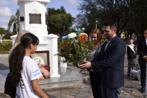 Posteriormente, los niños del Taller de Arte del Centro Cultural Municipal presentaron un retrato de Nicolás Avellaneda, realizado por ellos mismos, como símbolo de memoria colectiva. Luego, autoridades y estudiantes de la Esc. Nº 6104 depositaron una ofrenda floral al pie del busto en su honor.